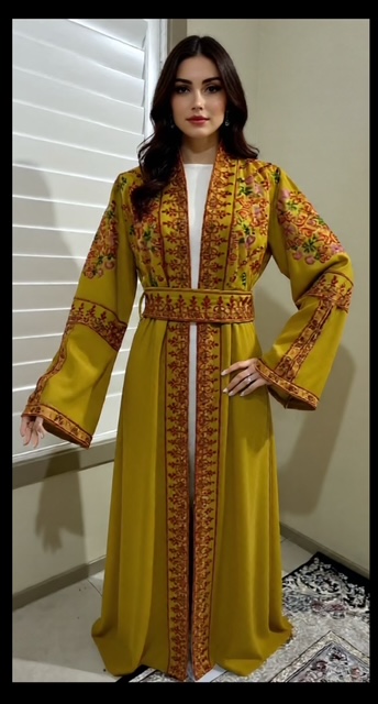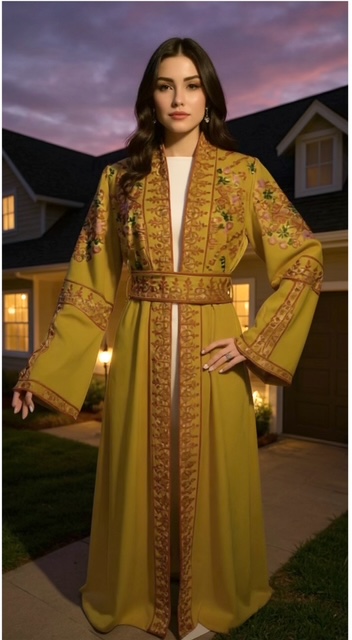 The Palestinian Embroidered mustard cardigan Tatreez, symbolizes the traditional and cultural women’s attire of Palestine. Additionally, Palestinian women deeply value embroidered attire as they obviously adorn these traditional cardigans with complex tatreez embroidery. Each cardigan features a unique pattern that often signifies the wearer’s regional origin within Palestine.