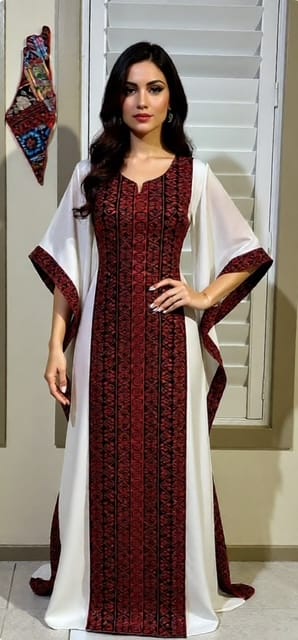 The Embroidered Tatreez Batwing Caftan , symbolizes the traditional and cultural women’s attire of Palestine. Additionally, Palestinian women deeply value Tatreez, as they obviously adorn these traditional dresses with complex embroidery (Tatreez). Each dress features a unique pattern that often signifies the wearer’s regional origin within Palestine.