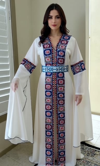 The Palestinian Embroidered White Cardigan with blue Tatreez is a piece of art. It symbolizes the traditional and cultural women’s attire of Palestine. Additionally, Palestinian women deeply value embroidered attire as they obviously adorn these traditional cardigans with complex tatreez embroidery. Each cardigan features a unique pattern that often signifies the wearer’s regional origin within Palestine.