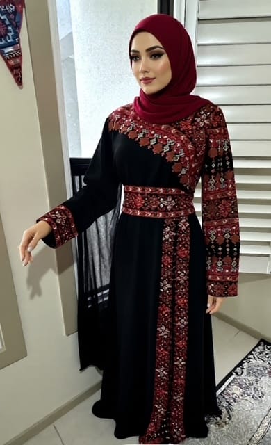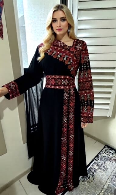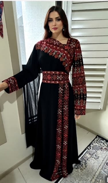 The Formal Embroidered Thobe Tatreez in black, symbolizes the traditional and cultural women’s attire of Palestine. Additionally, Palestinian women deeply value Thobes, as they obviously adorn these traditional dresses with complex tatreez embroidery. Each Thobe features a unique pattern that often signifies the wearer’s regional origin within Palestine.