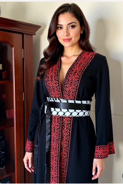 Furthermore, these Palestinian Embroidered Cardigans come in two distinctive designs: Long Sleeve and Sleeveless. Crafted from chiffon material in black and adorned with vibrant maroon embroidered edges, they embody exquisite craftsmanship.