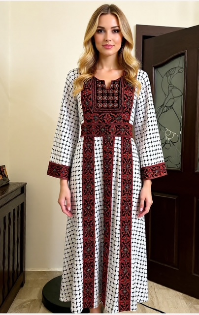 The Palestinian Thobe Embroidery Tatreez, in keffiyeh design, symbolizes the traditional and cultural women’s attire of Palestine. Additionally, Palestinian women deeply value Thobes, as they obviously adorn these traditional dresses with complex tatreez embroidery. Each Thobe features a unique pattern that often signifies the wearer’s regional origin within Palestine.
